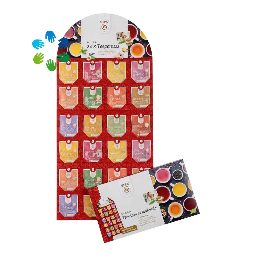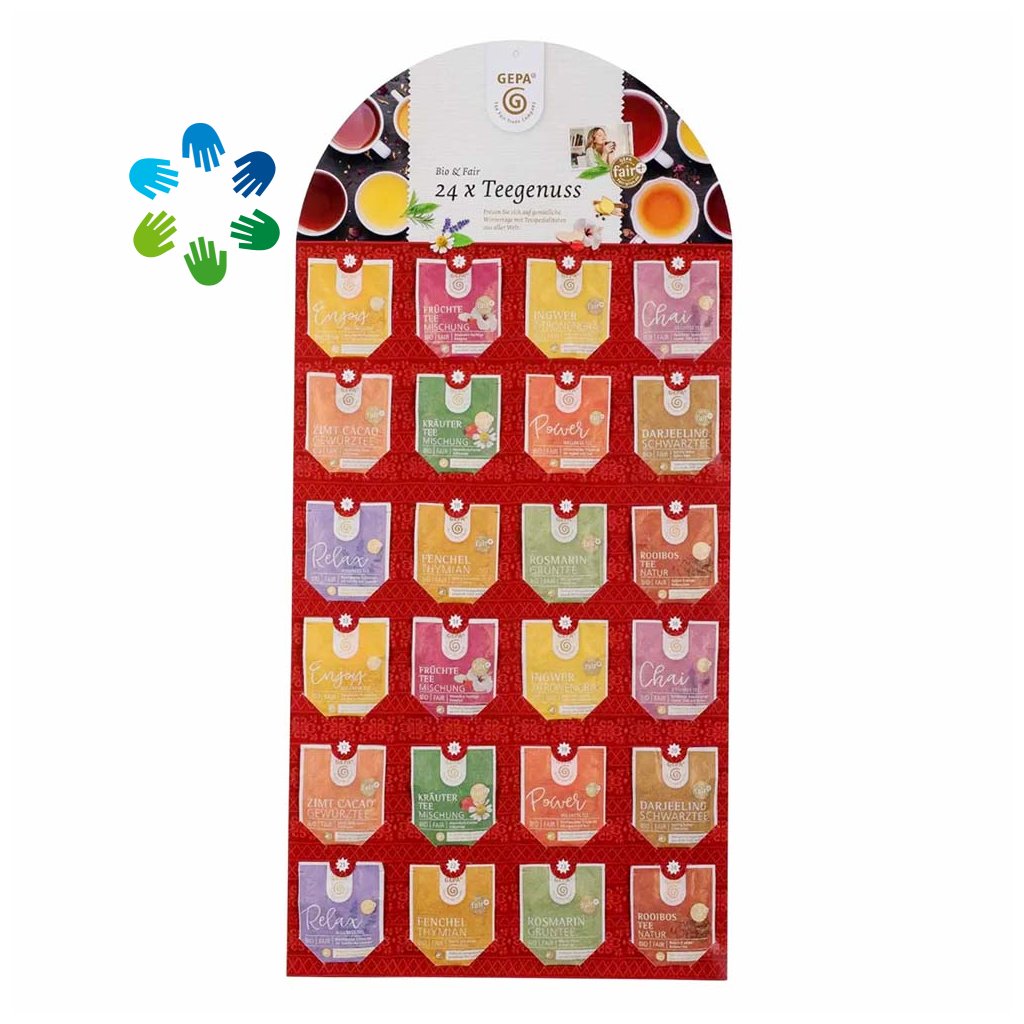 Velký závěsný čajový adventní kalendář s 24 čajovými sáčky 12 různých druhů z ekologického zemědělství Egypta, Burkiny Faso, Vietnamu, Jihoafrické republiky, Indie a Šrí Lanky. Žádný z čajů neobsahuje umělá aromata ani barviva. Každý sáček je přitom rozložitelný s nití z bio bavlny a vyndáte ho z rovněž kompostovatelné obálky bez hliníku s ochranným filmem pro uchování aroma čaje.