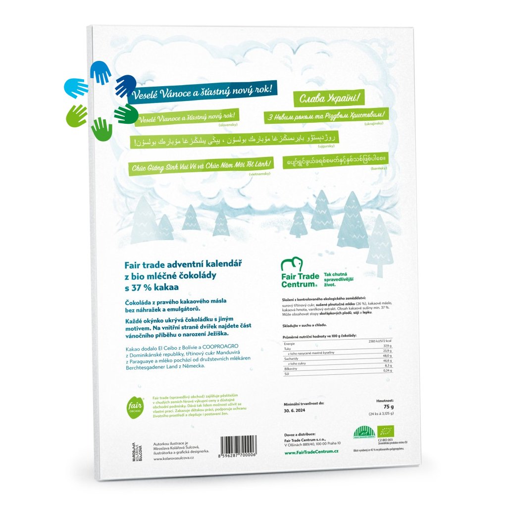 S velkou radostí představujeme letos nově podbarvený adventní kalendář Cesta čokolády, který minulý rok nakreslila a letos ještě dále vylepšila česká autorka Miroslava Kolářová Šulcová. Její edukativní ztvárnění cesty kakaa, výroby čokolády a doručení adventního kalendáře opět nikde jinde neuvidíte. Slavení vánočních svátků je tradiční záležitostí a tradicí naší firmy je představit každý rok jeden nový design fairtradového kalendáře s poctivou bio čokoládou uvnitř. Tím je letos adventní kalendář Etno a jako bonus vylepšujeme design z roku 2023. Na zadní straně všech dvířek také najdete kousek příběhu o narození Ježíška česky. Zadní strana kalendáře vás pak naučí popřát Veselé Vánoce a šťastný nový rok v jazycích několika národů, které jsou utiskované a my jim alespoň tímto způsobem vyjadřujeme jistou podporu.