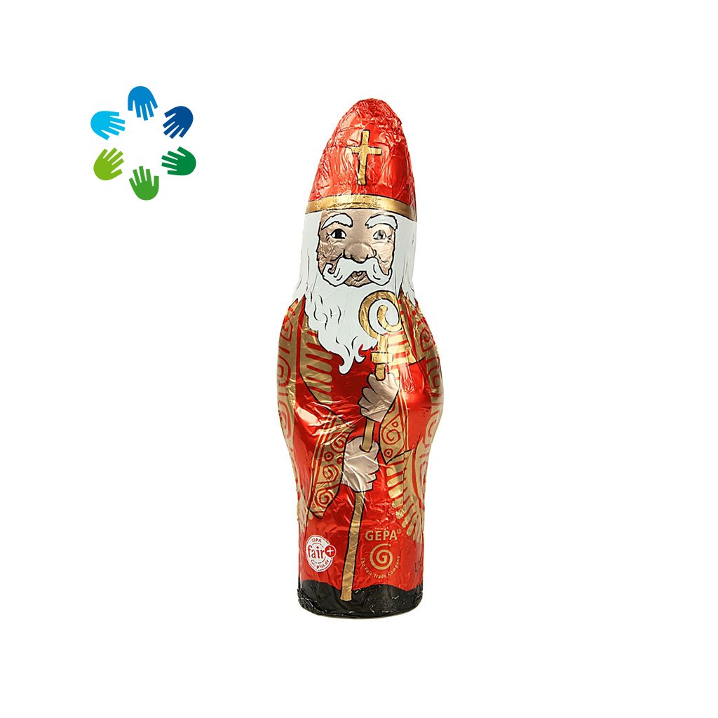 Poctivý Fair Trade mikuláš z bio mléčné čokolády s 33 % kakaa bez náhražek i napodobenin. Dopřejte letos dětem skutečně čokoládovou figurku sv. Mikuláše s příběhem.