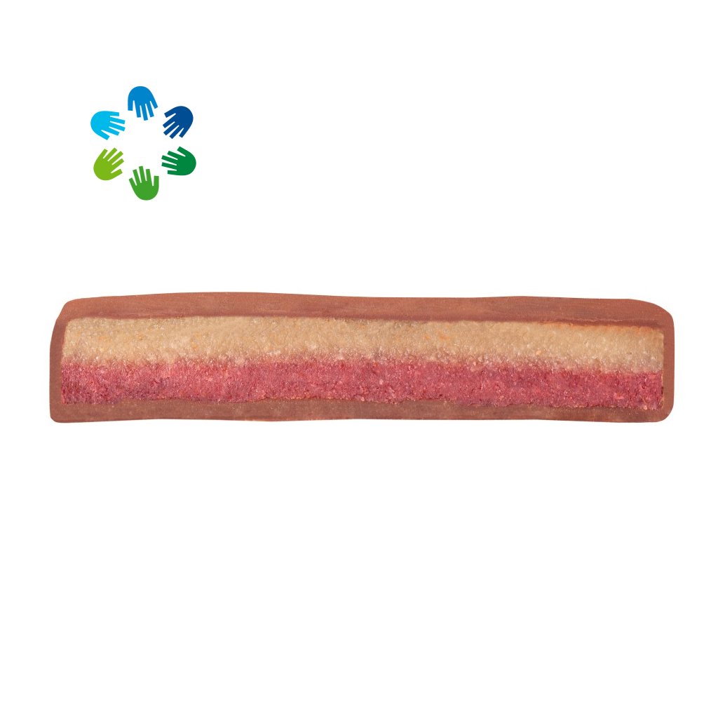 Jemný voňavý růžový marcipán (30 %) vyrobený z mandlí, růžového oleje a růžové vody spočívá na lákavé červené malinové ganache (30 %) vyrobené z pravých malin a malinové čokoládové polevy. Její krásná barva a ovocná chuť vznikají přirozeně pouze z použitých malin a borůvek. Nakonec se náplň obalí v mléčné čokoládě se 40 % fair trade kakaa.