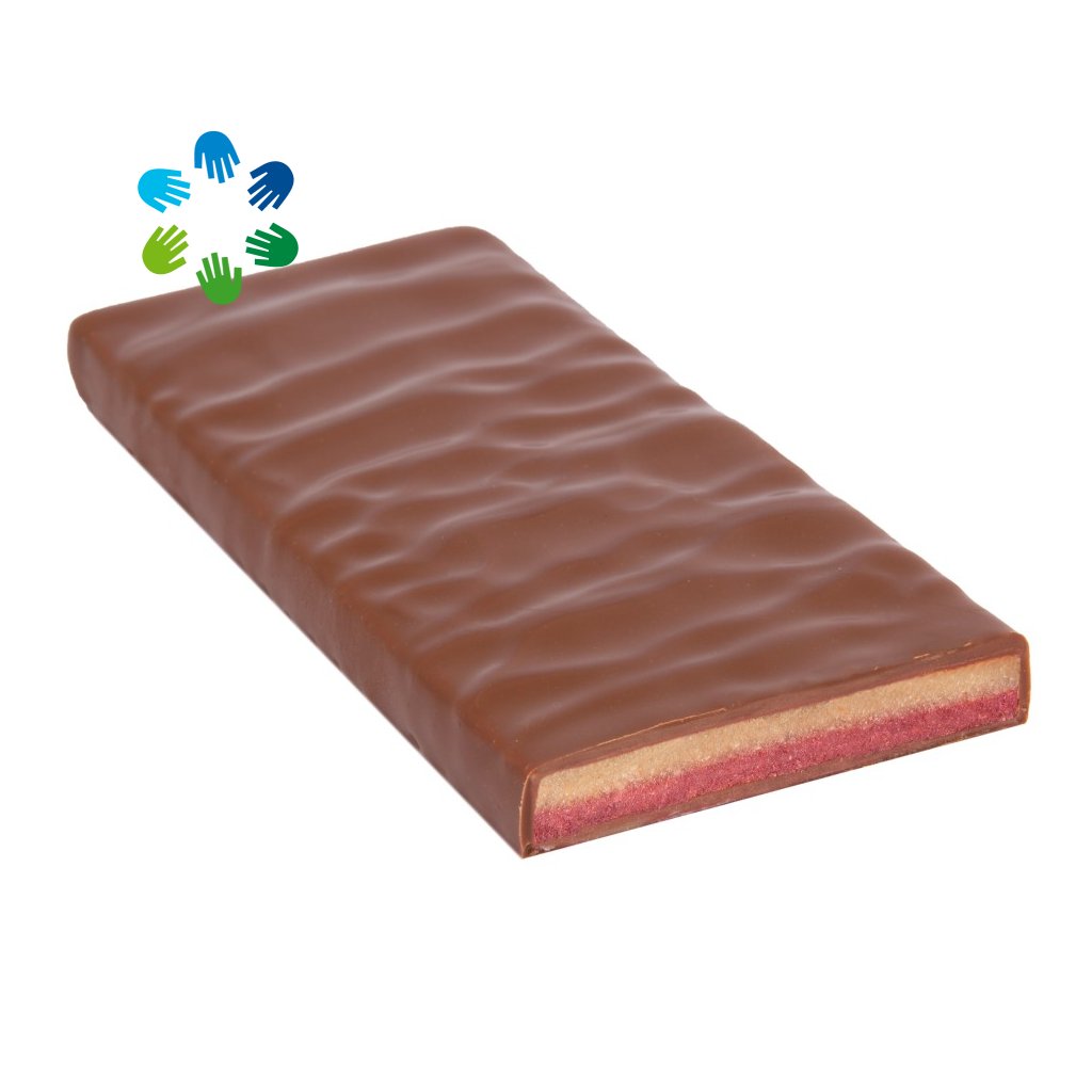 Okouzlující mléčná čokoláda se 40 % kakaa ručně plněná mandlovým růžovým marcipánem a malinovou ganache se skutečnými malinami. Bez lepku.
