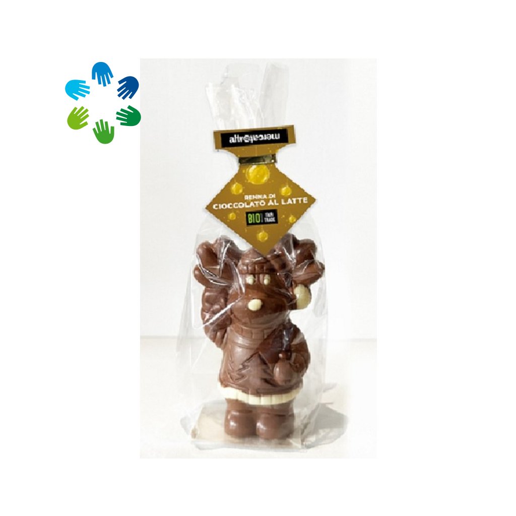 Usměvavý vánoční sob z jemné mléčné čokolády z 37 % fair trade kakaa, 22 % plnotučného mléka, třtinového cukru a vanilky. Bez lepku.