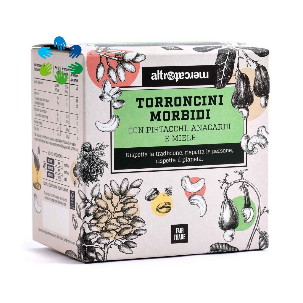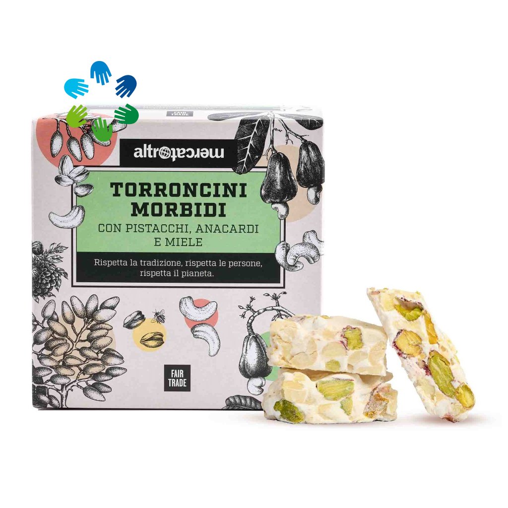 Jemnost medu, křupavost kešu oříšků a nezaměnitelná chuť pistácií v každém kousku měkkého jemného nugátu. To je autentická chuť nugátu ručně vyrobeného dle staré řemeslné tradice mistry v Cologna Veneta v severní Itálii z fair trade ingrediencí.